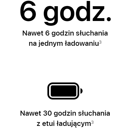 V tomto modelu sluchátek může baterie vydržet až 6 hodin poslechu hudby na jedno nabití. Při dobíjení z pouzdra můžete poslouchat hudbu až 30 hodin.