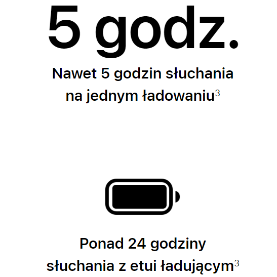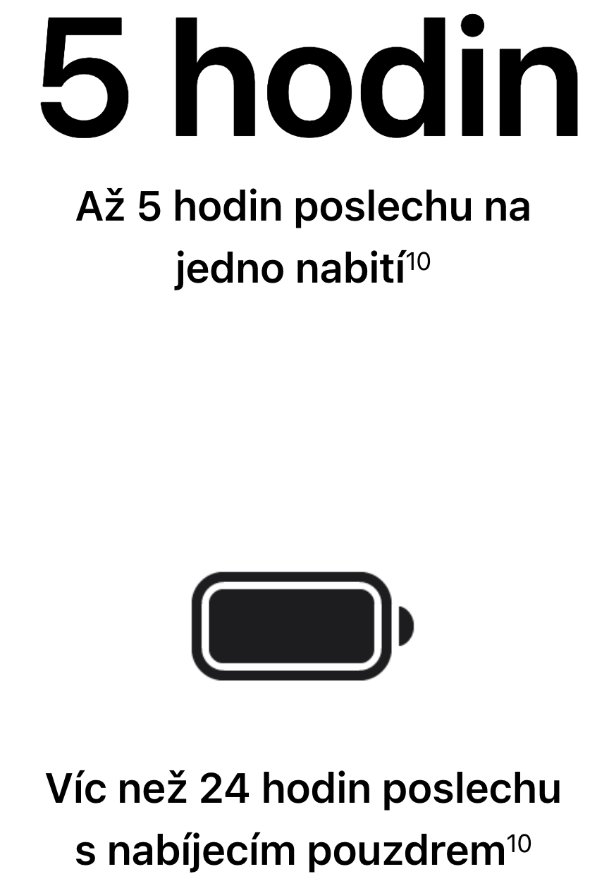 V tomto modelu sluchátek může baterie vydržet až 5 hodin poslechu hudby na jedno nabití. Při dobíjení z pouzdra můžete poslouchat hudbu až 24 hodin.